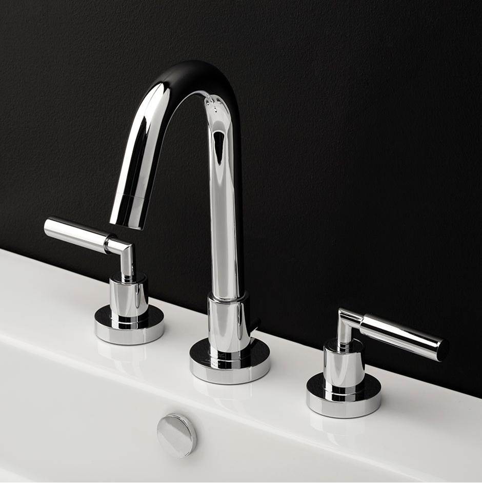Lacava Deck-mount three-hole faucet with a goose-neck swiveling spout, two lever handles, and a pop-up drain.
