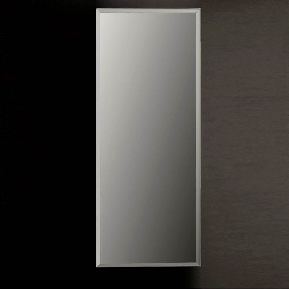 / Lacava Wall- mount beveled mirror with chrome edges. W; 15”, H: 34”, D: 1”.