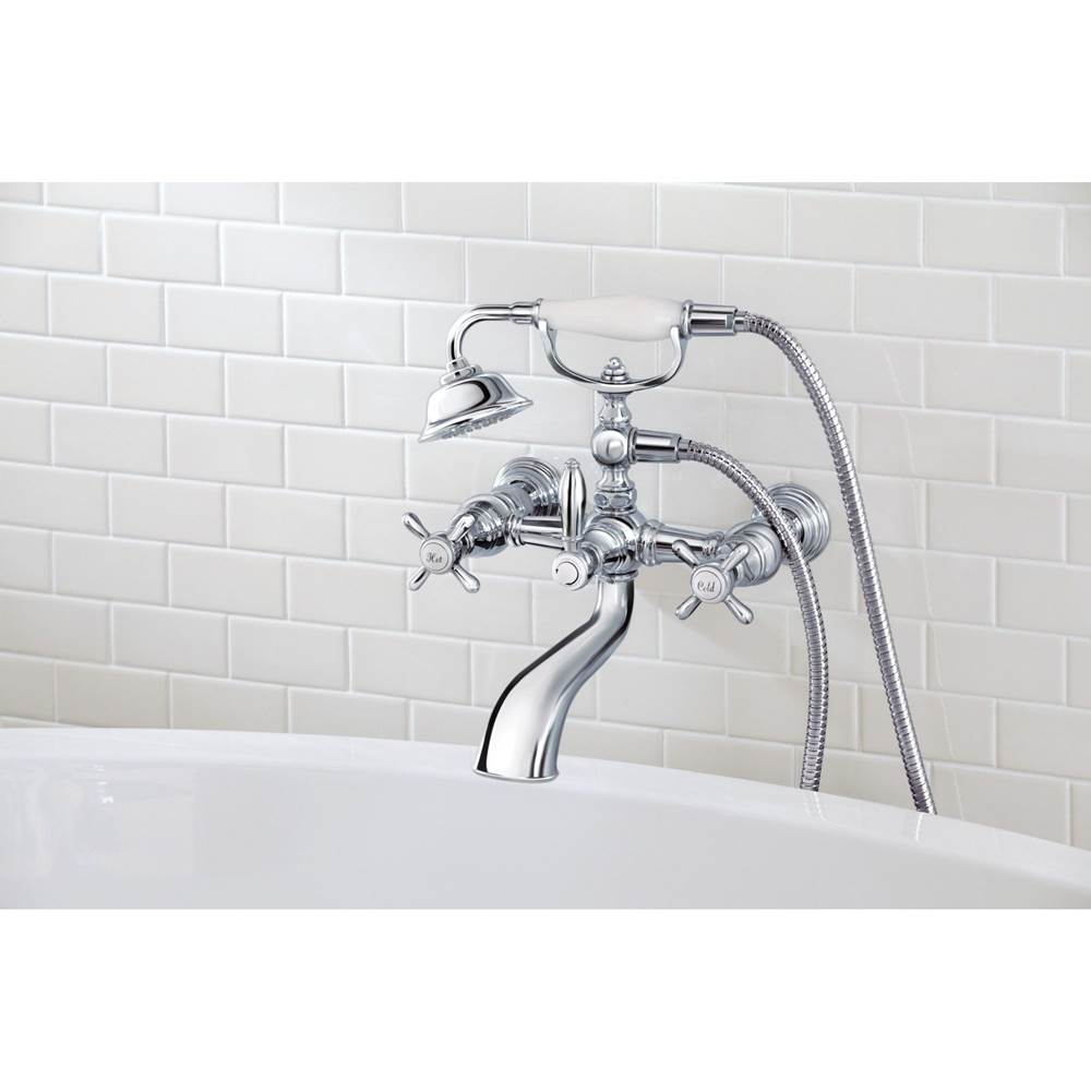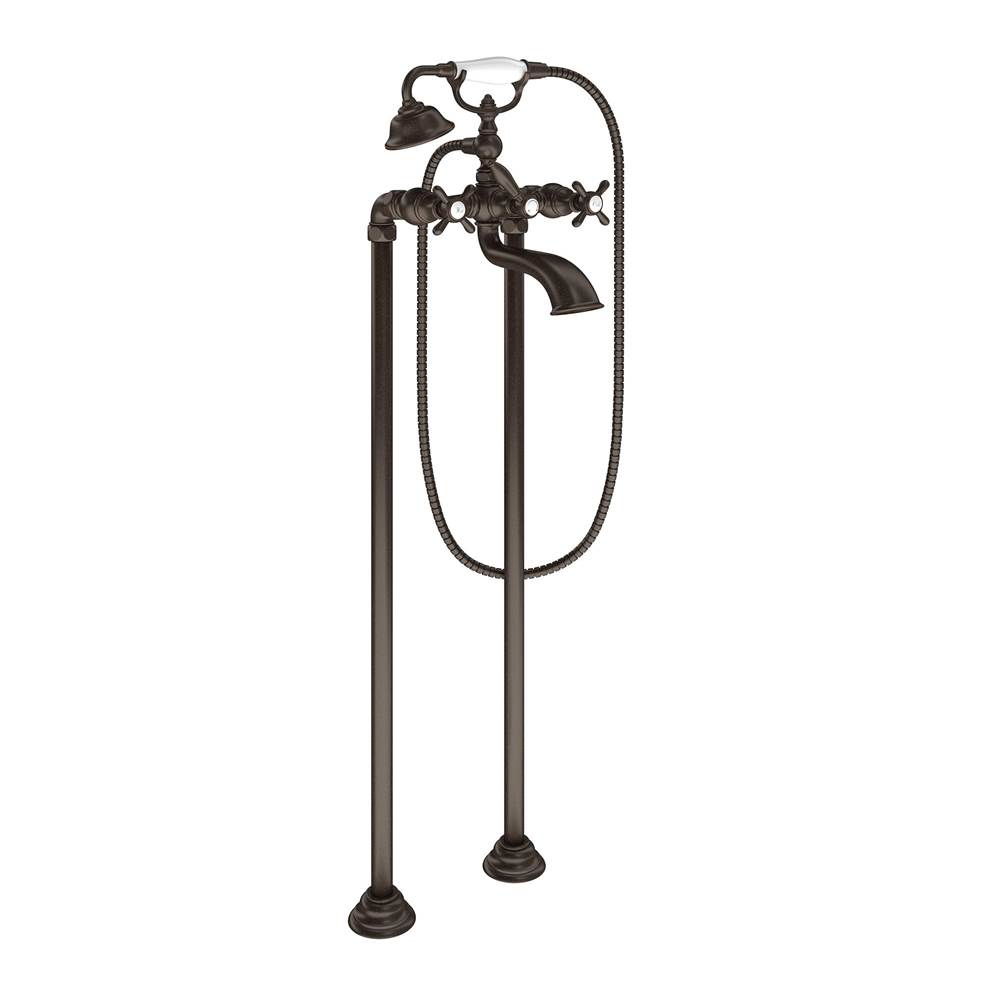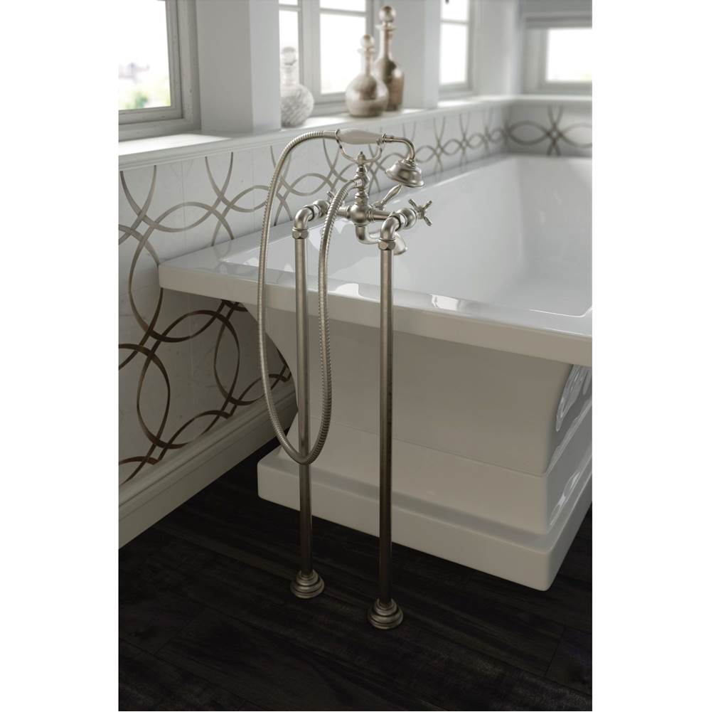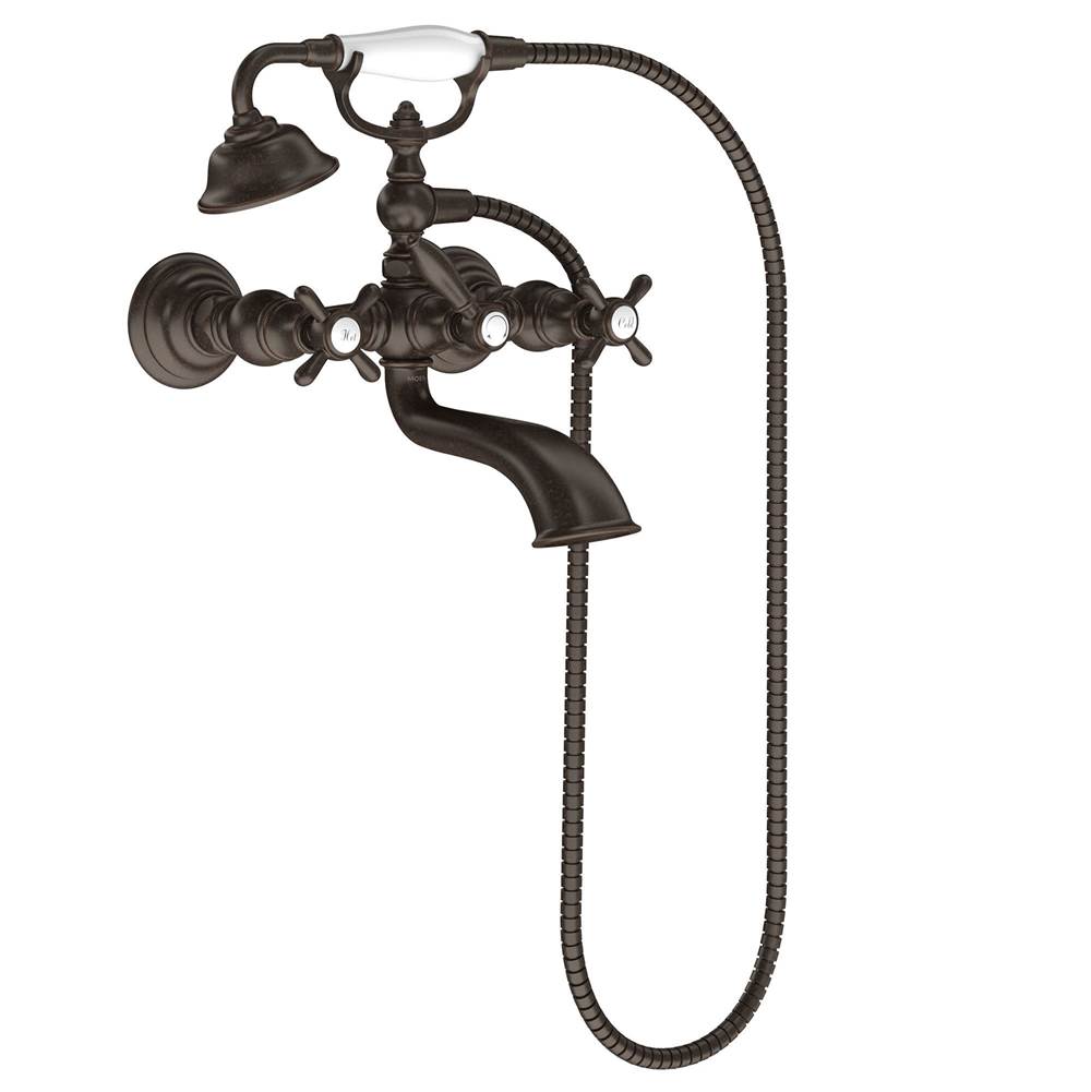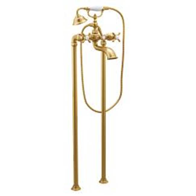 Moen Brushed gold two-handle tub filler includes hand shower